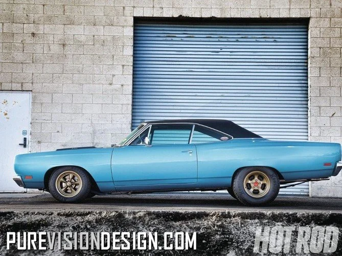 In 3 ½ weeks this Plymouth went from stray dog to late sixties Saturday Night Special! For the cool factor, it’s pretty hard to beat a 1969 Road Runner with a 440, a 4-speed and a Dana 60! But add a wicked drag race stance along with the “bigs and littles” and DANG! -that looks sweet!