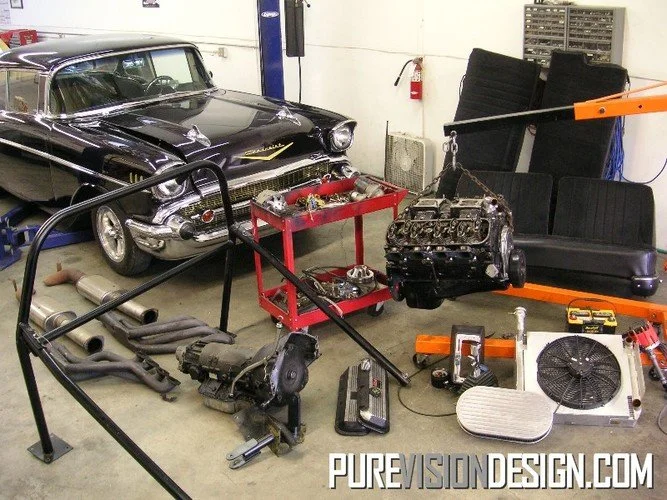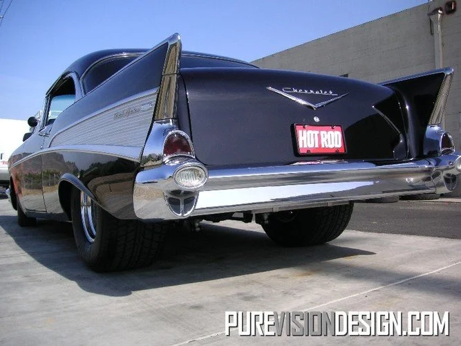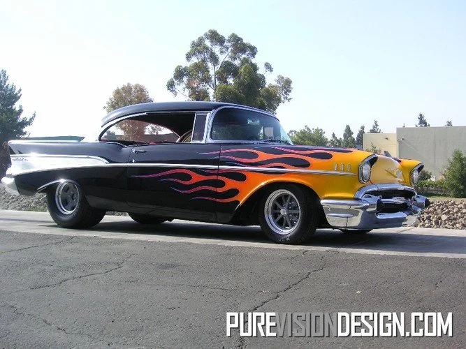 With a competition between Source Interlink magazines and their reputation on the line, Hot Rod Magazine hired Pure Vision to build another sweepstakes car! This time it was a ’57 Chevy for Timber Wolf Speed Shop. A Pro Street car with a vintage drag race theme.